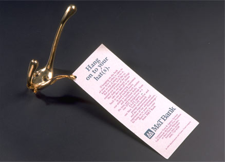 A series of tube mailers, each thematically wrapped and containing a different kind of headgear and attached message (e.g. a raccoon hat with the card reading "we're pioneers in corporate trust"), dramatized M&T's ability to "wear many hats", thus providing customers with a broader range of services in the competitive corporate trust arena.