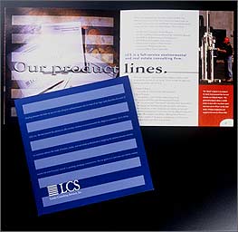 Flynn & Friends used LCS' logo as inspiration for this piece. Their logo, which consists of six horizontal lines, is adapted from the 3,000 year-old Chinese text called the I Ching, or Book of Changes. The cover of the brochure is a full-page version of this logo with copy in between each of the lines. We did this to make the point that LCS' ability to "read between the lines" (as the cover text also asked the reader to do) is what makes them unique.