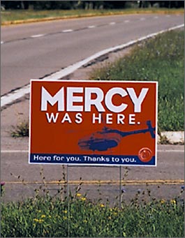 By designing and placing roadside signs that read "Mercy Was Here" at more than 3,000 corners, curves, and intersections where Mercy Flight had landed to rescue a critically ill or injured patient since 1981, we dramatized their lifesaving role in the community. A billboard campaign which generated 21 million impressions over two months added further impact to the campaign.
