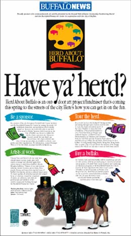 From logo to folder and t-shirts to web site, Flynn & Friends developed a distinct visual identity for this project, which hitched private sponsorship to public art and community pride. The project sold 150 buffalos, 50% more than its initial projection, and has already raised thousands of dollars for its beneficiaries.