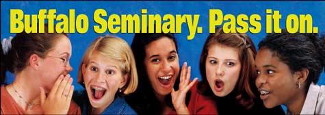 Five semi-hammy sophomores and juniors from Sem helped create an irresistible image--who doesn't want to hear "the latest"-- especially when you're a 12 or 13-year-old thinking of what high school to attend. The image was so popular with the school that they asked us to incorporate it in their development materials, in-house notepads, and alumni communications.